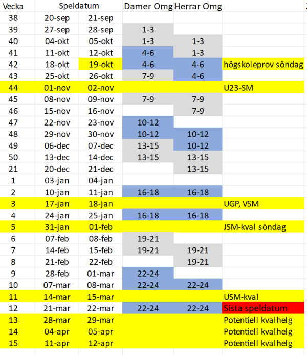Nedan finns en väldigt preliminär säsongsplanering. Dessa helger kommer matcherna i respektive serie i huvudsak att läggas. Se det som en rekommendation snarare än kravställd helg.