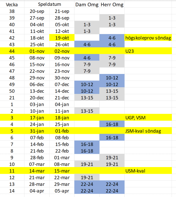 Nedan finns en väldigt preliminär säsongsplanering. Dessa helger kommer matcherna i respektive serie i huvudsak att läggas. Se det som en rekommendation snarare än kravställd helg.