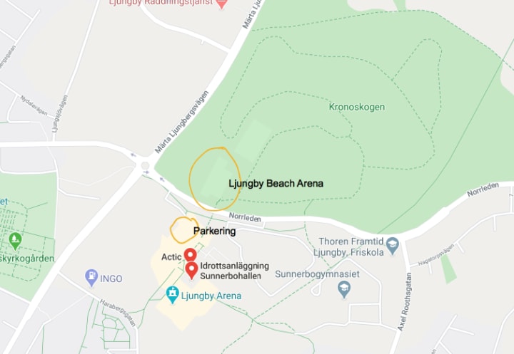 Det finns en stor parkering bara ett stenkast från arenan. Inga privata bilar får parkeras vid arenan. Det är fri parkering.