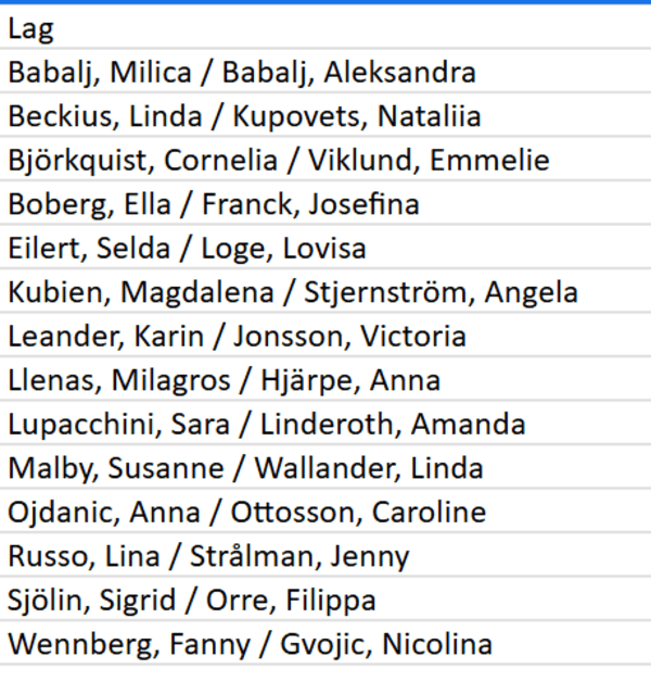 "... Lag som är anmälda innan anmälningstiden gått ut kan inte hamna utanför startfältet p.g.a. efteranmälda lag. Efteranmälda lag på reservlista, listas i anmälningstidsordning (inte efter poäng)." (Tävlingsbestämmelser Beachvolley 2025.2)