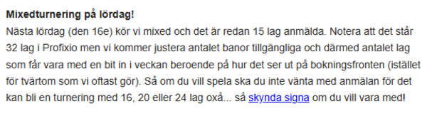 Hej! Vill bara meddela att alla anmälda lag får plats i turneringen! Ses på lördag.