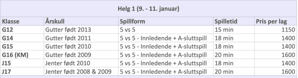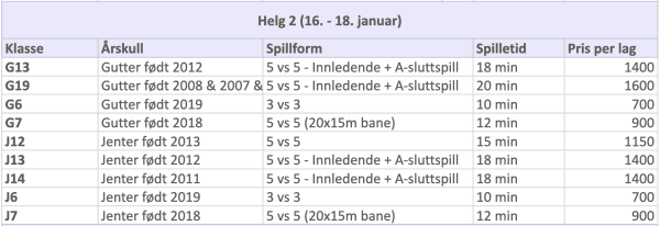 Tiller Futsal Cup følger årsklassene for Futsal-sesongen. F.eks G6/J6 = Spillere født 2019, G13/J13 = Spillere født 2012.