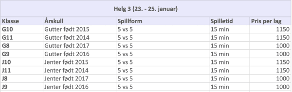 Spillehelger er koordinert med Malvik Cup, da denne foregår samtidig, men vi tar likevel forbehold om at endringer kan forekomme.